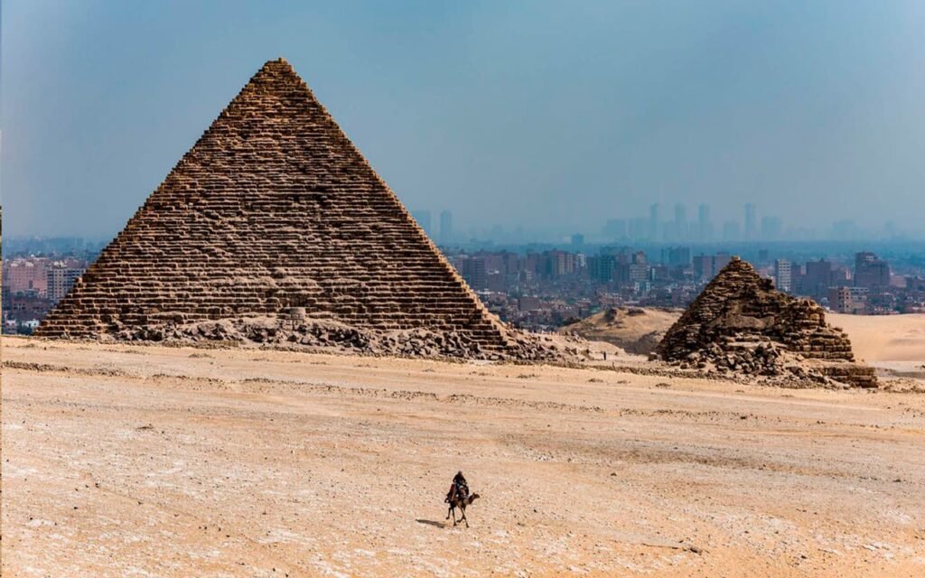 En la meseta de la provincia de El Giza, en el límite de la ciudad con el desierto libio, se levantan tres de los monumentos pertenecientes a una de las siete maravillas del mundo antiguo: las pirámides de Keops, Kefrén y Micerinos.